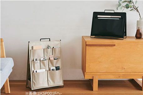 ポケットにサッと道具を入れるだけで、いつでも取り出しやすく、収納を快適にする「ツールスタンド」。道具を入れたまま、ハンドルを持って手軽に移動できます。また、使わないときは、折り畳んでコンパクトに収納できます。
