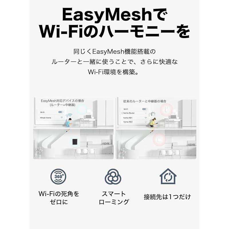 EasyMesh互換: EasyMesh対応のネットワーク機器と連携させることて?、シームレスで柔軟性に富んだ家じゅうをカバーするメッシュネットワークを構築します。