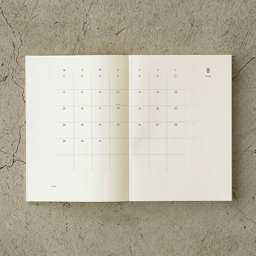 『MDノート』をベースに、ブロックタイプの月間スケジュールと、見開きで1週間スケジュールにも使える8分割の横罫メモ、さらに無罫のメモページで構成されたダイアリーです。たっぷり設けた余白とシンプルで使いやすいフォーマットが特徴。文庫、新書、A5の3種類を展開。A5サイズは、ノートとしても便利なサイズです。使う方のクリエイティビティを刺激するシンプルかつ使いやすさが魅力です。月間スケジュールは、ページの周りに余白をたっぷりと設けています。文字だけではなく、イラストなども自由に書くことができます。1ヵ月の予定とともに、余白にはメモやToDo、アイデアスケッチなどを書いたりと、使う方の自由度が高いフォーマットです。年度(’21)とDIARYの文字が印刷されているシールが付属しています。背表紙に貼ってお使いください。自分の名前やサイン、使用開始日、1年の抱負などを書いて見返しや扉に貼ることができる蔵書票シールも付属しています。本文に使われている「MD用紙」はにじみや裏抜けがしにくく、書き味の良さを追求し続けているオリジナルの筆記用紙です。【検索ハッシュタグ】#ミドリ#デザインフィルミドリ#ダイアリー#手帳#スケジュール#スケジュール帳#ジャーナル#年末品#日付品#2022#MD日付品#A5