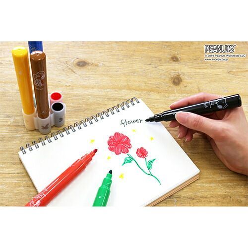 詳細情報6つのマーカーと一つのキャップ。水性のカラーマーカー「はにかむ」にスヌーピー柄が仲間入りしました。連結したキャップは散らかったり、失くす心配もありません。