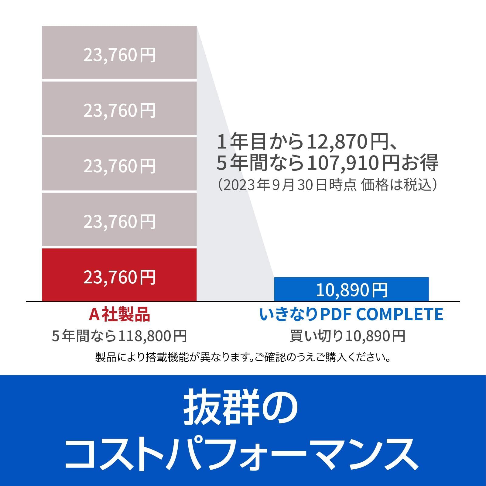 ポイント3:「いきなりPDF」は、価格そのものが安いうえに、毎年支払う必要がない買い切りライセンス。 サブスクリプションの他社製品と比べて、グッとお得です。高性能なので仕事の効率化に繋がるのはもちろん、経費削減にも大きく貢献します。