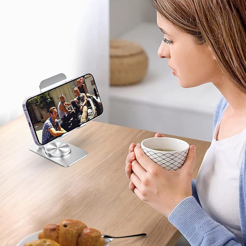 【360度回転式】スマホスタンド台座が360度回転するため、スマートフォンやアイフォンを載せたまま、見せたい向きに自由に回転させることができます。カチカチと軽めのいい音が出ながら回転してかなり高級感があります。姿勢を改善し、首、肩、背の疲労を和らげることができます。また、角度調整可能で、使用時に自分の快適な角度や高さを自由に調整できます。
