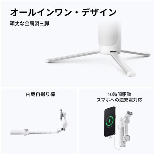 ■自撮り棒、三脚、そしてモバイルバッテリーを内蔵。コンパクトで持ち運びやすく、10時間の撮影が可能。外出先でスマートフォンのバッテリー残量が少なくなっても、Flow 2につないで充電できます。ポケットサイズで、いつでもどこでも撮影できます。すべての道具が1つにまとまっているので、他に機材は必要ありません