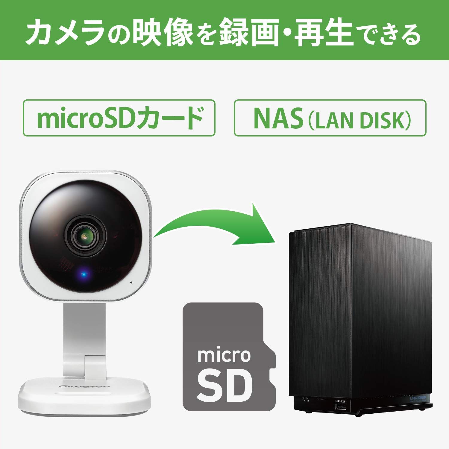 [特長]専用アプリを使ったかんたん設定、暗視機能、マイクスピーカー搭載で子供やペットの見守りに最適。[画質/録画]200万画素/動作検知/microSDカード(microSD/microSDHC/microSDXC(最大128GB迄))/NAS(LAN
