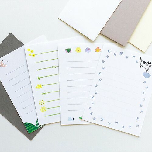 ほっこり、かわいいイラストが魅力のminiレターセット。贈り物に添えたり、ふたこと、みことのお手紙としてお使い頂けます。またレターセット自体ギフトにしてもすてきです。アラベール紙の便箋(サイズ90x120mm)1柄6枚と、コットン紙の封筒(サイズ65x100mm)3種3枚のセットです。お花の茎を罫線に見立てました。【検索ハッシュタグ】#ミニレターセット#miniレターセット#レターセット#スコープ#SCOPE#イラスト#アラベール紙#コットン#花摘み#はなつみ#花つみ#花
